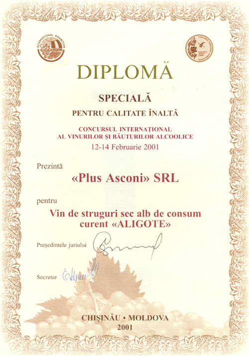 The diploma - special for higest quality The international competition of wine and alcoholic drinks February, 12-14th 2001 Aligote - Dry white wine ordinary